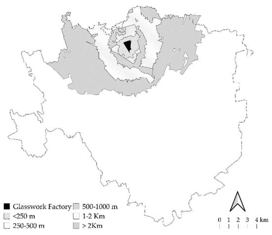 For the industry, a different approach was used. Since the contamination was mostly concentrated in a specific area, was the most industrialized, and had a clear hotspot corresponding to a glasswork factory, we shaped four different distance classes starting from the glasswork factory, namely 0–250 m, 250–500 m, 500–1000 m, and 1000–2000 m (Figure 4). For each class, the median SDI was calculated. Differences between SDI values within classes of distance were checked using Kruskal–Wallis, ANOVA, and the Conover–Iman test for pos-hoc comparisons.