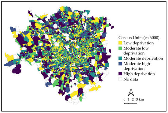 The socio-economic deprivation index was elaborated for each census unit and then sorted into quantiles; its distribution is reported in Figure 5.