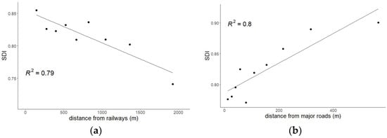 (a) Linear relation between the distance from major roads and SDI. (b) linear relation between distance from railways and SDI values.
