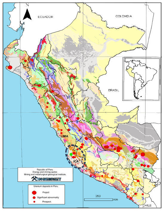 - Rivera, R. Realidad y Perspectivas de los Minerales Radioactivos en el Peru. INGEMMET. 2010. Available online: https://portal.ingemmet.gob.pe/documents/73138/202784/P11_Expo_Uranio.pdf/3bf404af-97c8-4b48-84e2-f84e0e1e5d9b (accessed on 24 October 2023).