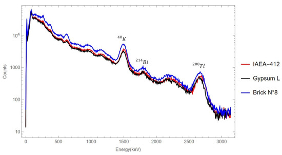 Gamma spectrum of various materials such as gypsum, brick, and the IAEA reference sample.