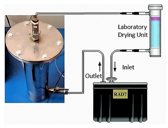 Determining radon exhalation from surface area of granular materials like soil, rock, or building materials is indeed a complex task due to the multiple factors that can influence the process. It often requires a combination of experimental techniques and modeling approaches to obtain accurate and meaningful results. Their granular nature means that the total exhalation surface is not just the external area, but includes the surfaces of individual particles. Additionally, variability in grain size, shape, and radon content, combined with the presence of intergranular spaces, complicates the measurement process. Therefore, in these cases, it is common to determine the radon exhalation rate as a function of mass [21,22]. In practical scenarios, building materials often degrade into smaller particles, where knowledge of the contribution of various components of building materials to the exhalation rate is required. A custom-designed cylindrical stainless steel accumulation chamber was used, in which the radon leakage rate was negligible, as confirmed in [16]. This chamber was connected to a RAD7 instrument through two valves to form a closed circuit, as shown in Figure 4.