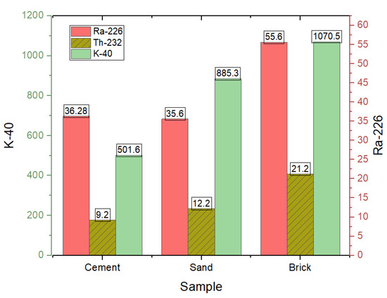 According to UNSCEAR [7], the average global activity levels of 226Ra, 232Th, and 40K have been measured at 35 Bq·kg−1, 30 Bq·kg−1, and 400 Bq·kg−1, respectively. Cement PR, cement PV, sand G, sand F2, concrete, and both brick samples had values slightly higher than the global average for 226Ra. For 40K, only cement A and cement PV had values lower than the global average. On the other hand, the concentration of 232Th in all samples was always lower than the global average. Gypsum samples had the lowest content of all primary radionuclides, while brick samples had the highest content of 226Ra (60.6 Bq·kg−1), 233Th (22.3 Bq·kg−1), and 40K (1074 Bq·kg−1). The low values of these radionuclides in a macroregion of potential interest for uranium exploitation have shown that they do not automatically imply high concentrations of natural radioactivity in construction materials derived from these areas. Therefore, radiological safety assessments should not be based solely on proximity to uranium-rich zones but on a detailed analysis of specific geological characteristics and direct measurements of radioactivity in building materials. In Figure 6, the averages of the activity concentrations of 226Ra, 232Th, and 40K for the sample groups of cement, sand, and brick are shown.