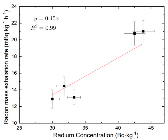 Table 2 summarizes the radon mass exhalation rate for all samples, the slope “m”, which represents the linear growth of the radon concentration during the first 24 h of measurement, and the radon emanation fraction f. A good correlation between the total radium and radon mass exhalation rate from cement samples was found as shown in Figure 7 (). The radon mass exhalation rate () varied from (4.50 ± 0.42) mBq·kg−1·h −1 to (22.34 ± 1.30) mBq·kg−1·h −1, with an average value of (14.01 ± 1.04) mBq·kg−1·h−1. The average radon mass exhalation rates from the cement and gypsum samples were comparable with the values reported by [37]. The radon exhalation rate from the bricks was higher than from other samples. Gypsum samples did not show significant radon exhalation, which is consistent with the amount of radium in these samples. The radon emanation fraction for each building material was determined using Equation (3). The average values were 5.9% for cement, 8.6% for sand, 7.1% for concrete, 5.1% for rock, and 11.6% for bricks. Figure 7 shows a strong positive correlation (0.99) between the radium activity concentration and the radon exhalation rate for cement samples.