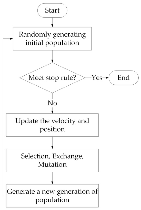 The method described in the paper utilizes the particle swarm algorithm as its main component, with the genetic algorithm embedded within it [30]. This combination effectively combines the strengths of global search and local search, resulting in improved search performance [31]. To prevent the algorithm from getting trapped in local optima, the inertia weights are set to decrease linearly. This ensures that the algorithm searches rapidly in the initial stages while producing more accurate results in the later stages [32]. The fusion algorithm in this paper employs the parameters shown in Table 1. The number of iterations and population size are both correlated with the search space and search time. The typical range of population size is from 10 to 100. A larger population size allows for more exploration but may increase computation time. The inertia weight controls the balance between exploration and exploitation, with typical values ranging from 0.4 to 0.9. A higher value promotes exploration, while a lower value promotes exploitation. The individual learning factor and social learning factor are parameters that control the influence of the particle’s personal best position and the global best position, respectively; typical values range from 1 to 2. A higher cognitive weight emphasizes personal experience, while a higher social weight emphasizes the influence of the swarm. The exchange rate represents the probability of crossover occurring between two individuals during reproduction, with typical values ranging from 0.2 to 0.9 [33,34]. A higher crossover rate promotes exploration and genetic diversity. The mutation rate represents the probability of a gene mutation occurring during reproduction, with typical values ranging from 0.01 to 0.2. A higher mutation rate allows for more exploration and prevents premature convergence [35]. The parameter values in Table 1 are chosen considering the search accuracy and search time.