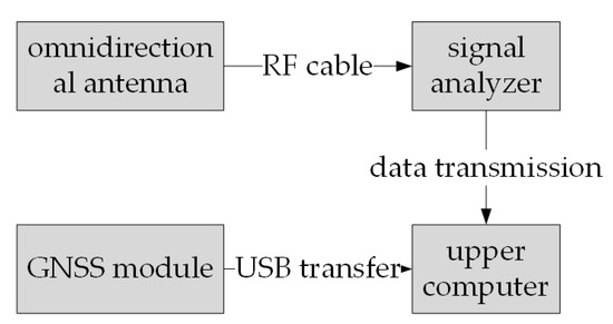 To analyze the channel characteristics, the location of the transmitting source is required. In order to obtain these data, a system for monitoring radio signals from existing artificial sources is designed using intelligent data acquisition techniques. This system is capable of receiving a large number of radio signals from the study area through mobile measurements. The received data includes information such as time, longitude, latitude, altitude, and received power of the signals. The hardware system architecture for this monitoring system is depicted in the block diagram shown in Figure 3. The external shortwave FM antenna is connected to a signal analyzer, which captures the data within the specified bandwidth. These data are then transmitted to the host computer for further calculation and display. Additionally, a Global Navigation Satellite System (GNSS) module is directly connected to the host computer to provide real-time latitude, longitude, and altitude information. The host computer is responsible for measurement control, information display, and data acquisition.