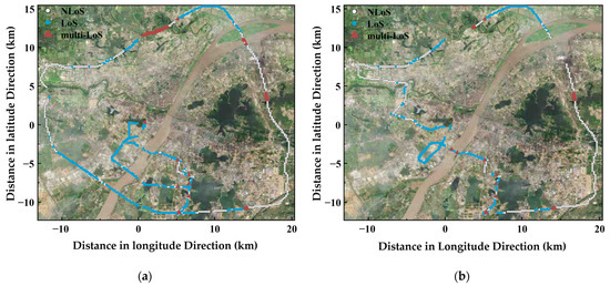 Figure 4a shows the regional distribution of LoS path channels (LoS), LoS multipath channels (multi-LoS), and NLoS multipath channels (NLoS) in campaign 1. Figure 4b shows the regional distribution of LoS channels, multi-LoS channels, and NLoS channels in campaign 2 (The origin point is at the transmitting point). Table 3 shows the number of LoS channels, multi-LoS channels, and NLoS channels on Path 1 and Path 2. The results calculated by the method proposed in Section 3 are shown in Figure 5 and Table 3.