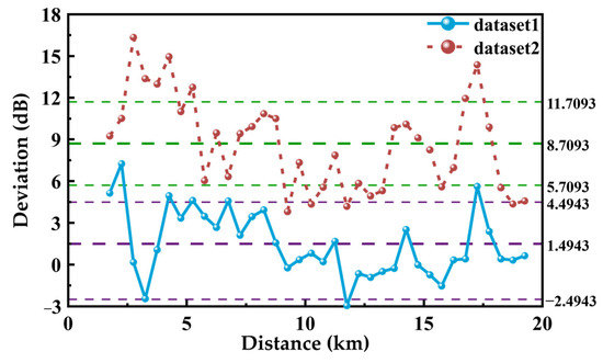 In order to analyze accurately the model to which the measured data belongs, the data of each point is distinguished from the deterministic model, Okumura–Hata model and Egli model in comparison. Figure 5a shows the distance loss obtained for dataset 1. The measured data fluctuates around the deterministic model. After the comparison of spatial clustering, the comparison results are obtained, as shown in Figure 6 in dataset 1. The mean of the deterministic model and the measured data are calculated every 500 m. Next, subtract the mean of the deterministic model from the measured data to obtain the deviation. There are two data points with large undulation; compared with the dataset mean line, the first location is at 2.25–4.75 km, which is the path conforming to the Okumura–Hata model, with a deviation of 3.07–5.76 dB; the second location is at 17.25 km, with a deviation of 3.07–5.76 dB, which is the path conforming to the Egli model; the rest of the data are roughly within 3 dB and are classified as path data of the deterministic model. Dataset 2, shown in Figure 4b, has an upward shift compared with the deterministic model, but the error shape in Figure 6 is consistent with that of dataset 1, with deviations of 4.04–7.63 dB and 5.66 dB at both locations. Considering deviations such as frequency variations and different paths, the correct channel model can be obtained as well.