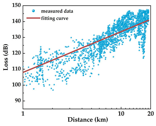 A curve is fitted from Equation (2), where d is determined by the position of the source and the receive site, and it is the independent variable; Lnew is determined by the actual received power, and it is the dependent variable; M and A are the coefficients to be fitted. The results are depicted in Figure 7.