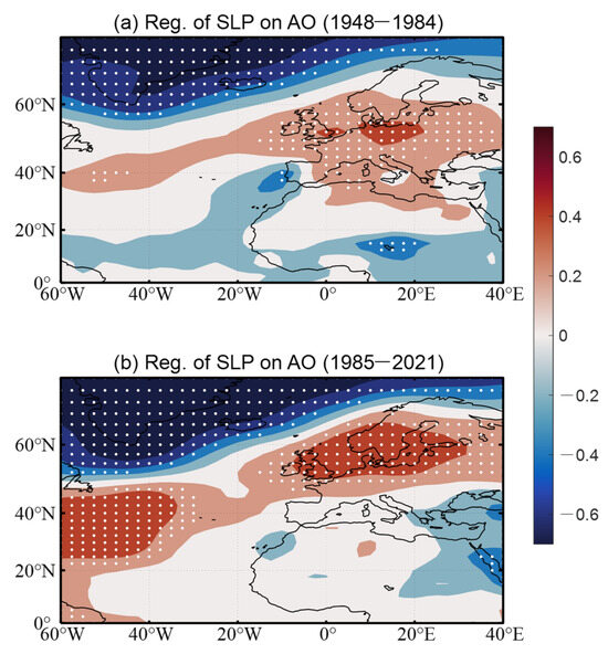 Regression of the JJA SLP on the AO index (a) from 1948 to 1984 and (b) from 1985 to 2021 over the North Atlantic. All the indices have been normalized. The dotted areas indicate that the correlations are significant at a 90% confidence level.