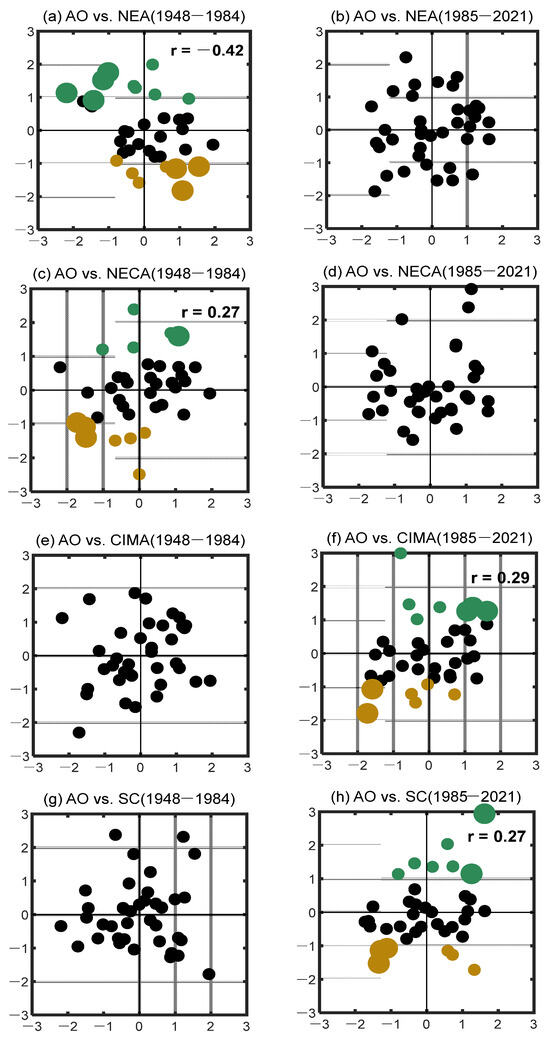 Scatterplot of AO index (x axis) versus (a) NEA_Rain, (c) NECA_Rain, (e) CIMA_Rain, and (g) SC_Rain (y axis) before the mid-1980s. (b,d,f,h) as in (a,c,e,g), but for the period after the mid-1980s. The green (brown) dots represent rainy (drought) summer events with normalized values greater than (less than) 0.90 (−0.90). The bolded green (brown) dots indicate the rainy (drought) summer events contributed by AO (i.e., the absolute value of the standardized AO index exceeds 0.90). The bolded r indicates that the correlation is statistically significant at a 90% confidence level.