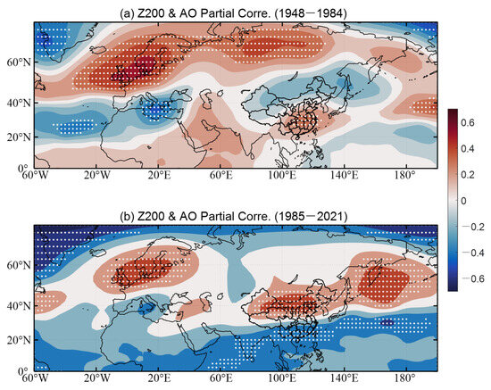 Partial correlations (by removing the influence of ENSO) between the JJA Z850 and the JJA AO index (a) from 1948 to 1984 and (b) from 1985 to 2021. All the indices have been normalized. The dotted areas indicate that the partial correlations pass the confidence test at a 90% confidence level.