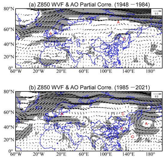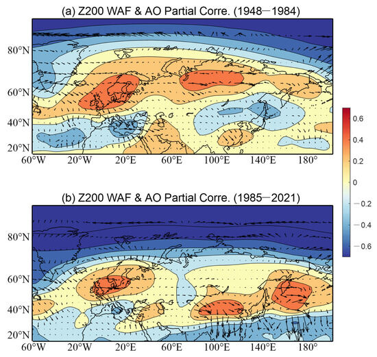 Partial correlations (by removing the influence of ENSO) between the JJA horizontal wave activity flux (vectors) and stream function (shading) at 200 hPa and the JJA AO index (a) from 1948 to 1984 and (b) from 1985 to 2021.