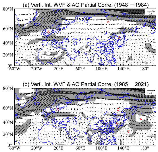 Partial correlations (by removing the influence of ENSO) between the JJA water vapor flux at 850 hPa and the JJA AO index (a) from 1948 to 1984 and (b) from 1985 to 2021. All the indices have been normalized. The shadings indicate that the partial correlations are statistically significant at a 90% confidence level. The blue lines represent the national boundaries and provincial boundaries of China and the coastlines of continents. The letter A stands for water vapor divergence and the letter C stands for water vapor convergence.