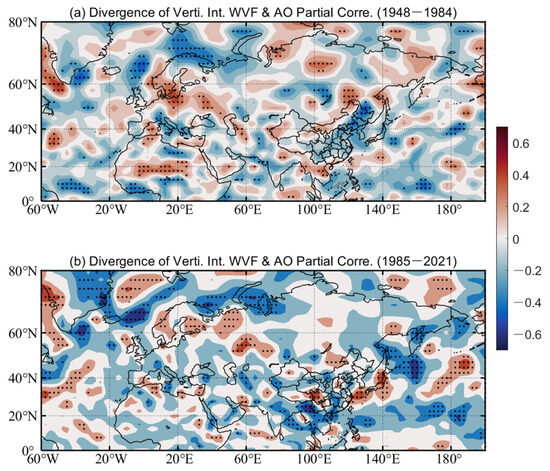 Partial correlations (by removing the influence of ENSO) between the JJA divergence of vertically integrated water vapor flux and the JJA AO index (a) from 1948 to 1984 and (b) from 1985 to 2021. All the indices have been normalized.