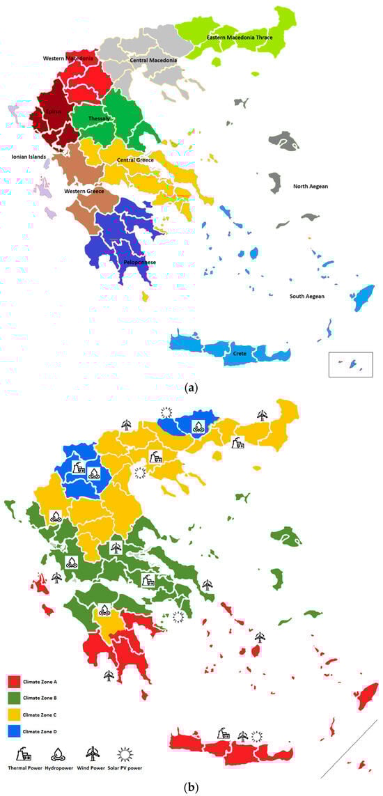 Map of the study area (Greece) showing (a) regions and (b) the climate zones and representative locations of power stations examined in this study.