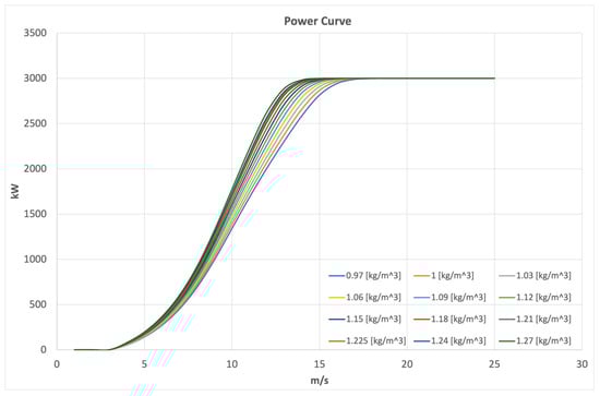 Power curve of a typical commercial wind turbine (Vestas V90) with a nominal capacity of 3 MW for various values of air density in kg/m3.