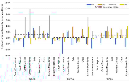 The results for the period 2021–2050 and for the three examined RCP scenarios are presented in Figure 3, and they are similar to the findings of other studies for Greece (e.g., [4]). In all three RCP scenarios, the annual capacity factor is expected to change between −4.0% and +4.0% compared to the reference period 1971–2000, with the exception of the climate simulation m1 (models CCLM4-8-17/CLMcom-ICHEC-EC-EARTH), which estimate an 8–10% increase in some areas of the mainland country (Central Greece, Central and Eastern Macedonia—Thrace) for scenario RCP2.6.