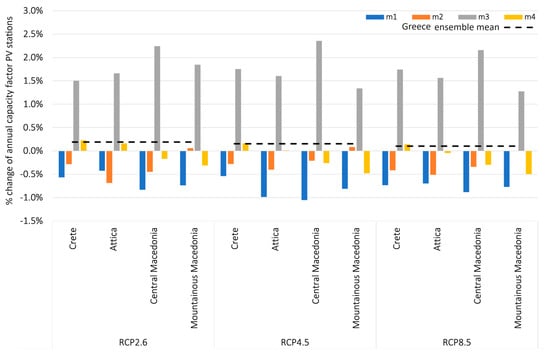 Average change in the annual capacity factor of the PV stations in 2021–2050 compared to the reference period, 1971–2000, based on the results of 4 climate simulations in 4 representative regions of Greece under the examined RCP scenarios. The horizontal lines show the average value of the change for all the areas of interest in the country under each RCP scenario. Climate model simulations: m1: CCLM4-8-17/CLMcom.ICHEC-EC-EARTH, m2: HIRHAM5/DMI.ICHEC-EC-EARTH, m3: RACMO22E/KNMI.CNRM-CERFACS-CNRM-CM5, and m4: REMO2009/MPI-CSC.MPI-M-MPI-ESM-LR.