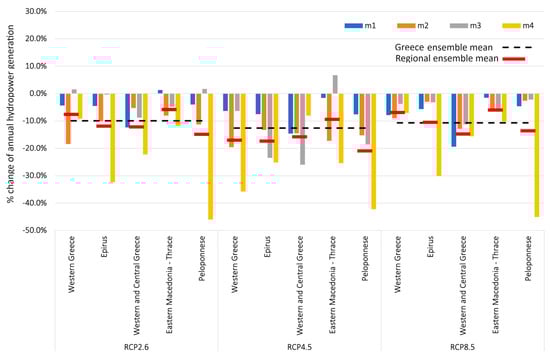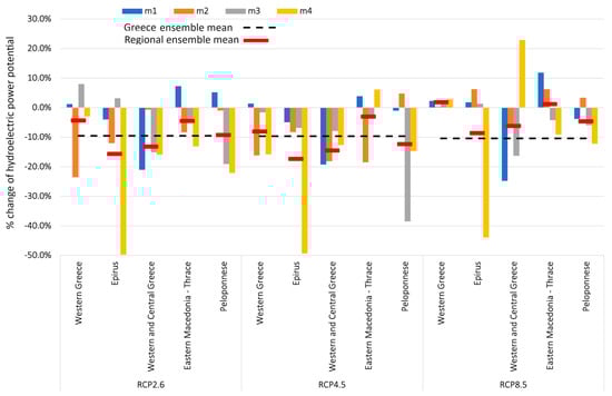 Percentage change in hydropower generation during 2021–2050 compared to the reference period, 1971–2000, in Greece based on statistical regression models and the results of four climate simulations in five geographical regions under the three RCP scenarios. The horizontal red lines show the changes in hydropower generation based on the ensemble of the results of the four climate simulations. The horizontal black dashed lines show the weighted average value reduction in hydroelectric production in the country for each climate scenario. Climate model simulations: m1: CCLM4-8-17/CLMcom.ICHEC-EC-EARTH, m2: HIRHAM5/DMI.ICHEC-EC-EARTH, m3: RACMO22E/KNMI.CNRM-CERFACS-CNRM-CM5, and m4: REMO2009/MPI-CSC.MPI-M-MPI-ESM-LR.