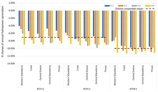 Based on the results of the first impact assessment approach (i.e., theoretical models for estimating hydroelectric potential in an area which take into account surface runoff, water density, and dam height), the estimated reduction in hydroelectric potential in Greece is significant, with a large variation within the models under each scenario (Figure 5), while in some cases, there is even a difference in the sign of the changes between the models for the same area. The wide range of results and the difference in the sign of the change demonstrate the uncertainty that exists in estimates of precipitation and runoff changes in climate models. More specifically, changes between future and historical climates range between the following: