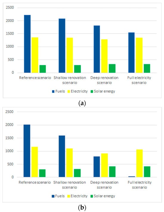 Estimated energy consumption by energy carrier in the Greek residential sector in 2030 (a) and 2050 (b) based on the examined scenarios (in ktoe).