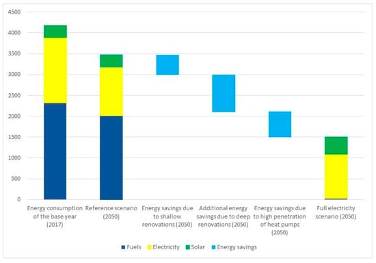 Figure 8 presents the calculated energy consumption per energy carrier in the Greek residential sector forecasted by 2030 and 2050, respectively, under the current climate, based on the scenarios defined for the energy performance of buildings as well as the electrification of the sector (Section 2.3). Figure 9 presents an overview of the evolution of energy consumption in the Greek residential sector in the period 2017–2050, as well as the effect of the main mitigation actions under consideration for the decarbonization of the sector. Obviously, the latter is feasible to the extent that the electricity used for the remaining energy needs of the sector will be generated by RES technologies.