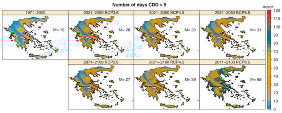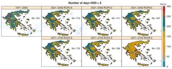 As already mentioned, climate change, mainly through increasing temperatures, is expected to affect energy demand (theoretical and final) in the sector. In the context of the present analysis, it is considered that climate change will affect only the energy demand for cooling and heating. In Figure 10 and Figure 11, the average annual number of days with increased demand for heating and cooling, respectively, for the reference period, 1971–2000, as well as for two future periods, 2021–2050 and 2071–2100, under three future scenarios (RCP2.6, RCP4.5, and RCP8.5), is shown. Based on these figures, it appears that the future climate will be characterized by the following:
