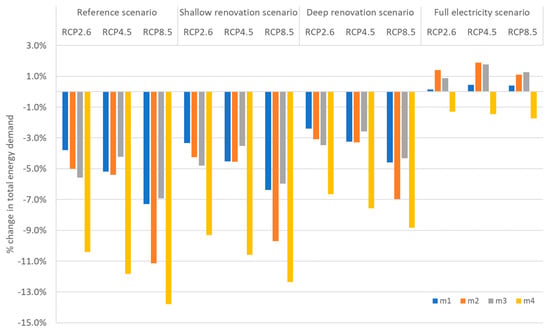 Percentage change in total energy demand of the Greek residential sector in 2050 due to climate change for all measure scenarios, climate scenarios, and climate model simulations considered. Climate model simulations: m1: CCLM4-8-17/CLMcom.ICHEC-EC-EARTH, m2: HIRHAM5/DMI.ICHEC-EC-EARTH, m3: RACMO22E/KNMI.CNRM-CERFACS-CNRM-CM5, and m4: REMO2009/MPI-CSC.MPI-M-MPI-ESM-LR.