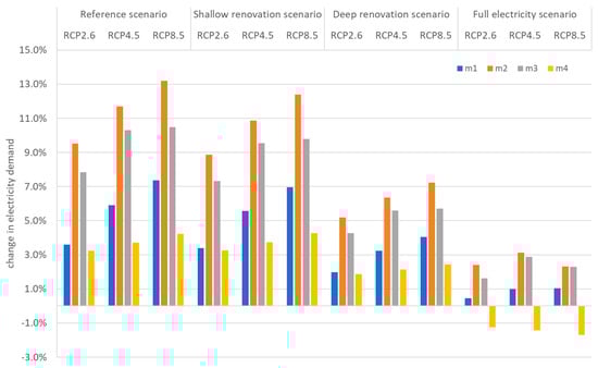 Percentage change in electricity demand of the Greek residential sector in 2050 due to climate change for all measure scenarios, climate scenarios, and climate model simulations considered. Climate model simulations: m1: CCLM4-8-17/CLMcom.ICHEC-EC-EARTH, m2: HIRHAM5/DMI.ICHEC-EC-EARTH, m3: RACMO22E/KNMI.CNRM-CERFACS-CNRM-CM5, and m4: REMO2009/MPI-CSC.MPI-M-MPI-ESM-LR.
