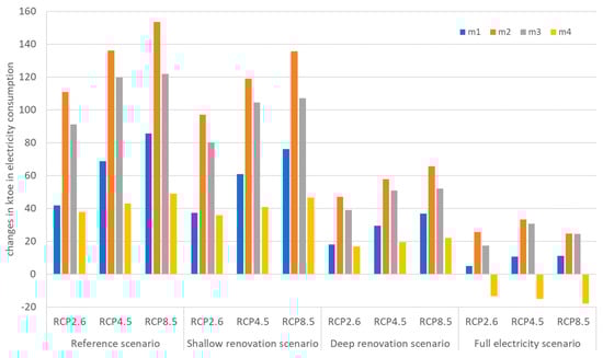 Changes in electricity consumption due to climate change in the Greek residential sector in 2050 for all measure scenarios, climate scenarios, and climate model simulations considered (in ktoe). Climate model simulations: m1: CCLM4-8-17/CLMcom.ICHEC-EC-EARTH, m2: HIRHAM5/DMI.ICHEC-EC-EARTH, m3: RACMO22E/KNMI.CNRM-CERFACS-CNRM-CM5, and m4: REMO2009/MPI-CSC.MPI-M-MPI-ESM-LR.