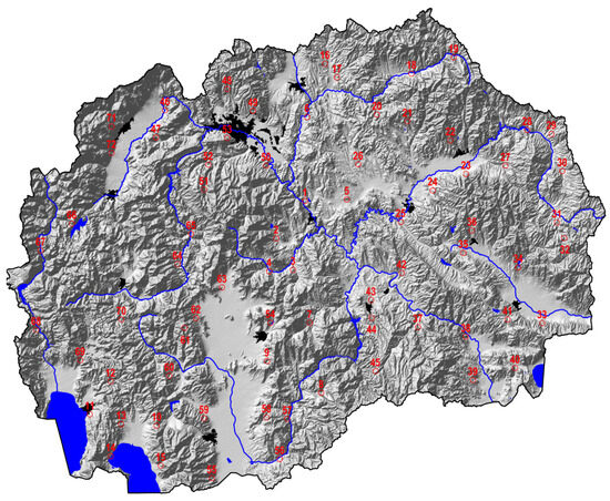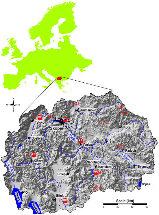 Macedonia is located in the central part of the Balkan Peninsula (Figure 1). It covers an area of 25,700 km2 with a total population of 1,836,713 inhabitants (in 2021). The landscape is predominantly rugged and lies between the Šar and Osogovo Mountains, which frame the valley of the Vardar River. Macedonia has significant deposits of chromium and other non-ferrous metals (Cu, Pb, Zn, Ni, and Mn). The country also has gypsum, marble, and granite mines. Due to its characteristic natural and geographical features, Macedonia has two different climatic zones: a modified Mediterranean climate and a temperate continental climate [38].
