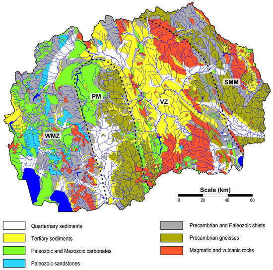 Geological map of Macedonia: SMM—Serbo-Macedonian massif, VZ—Vardar zone, PM—Pelagonian massif, WMZ—West-Macedonian zone, CKZ—Cukali-Krasta Zone, and KZ—Kraishtide Zone [40].