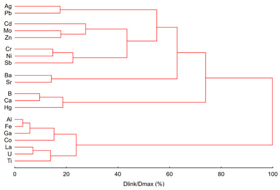 The resulting cluster analysis, which includes 20 elements, produces 7 subclusters, leading to the separation of 6 main clusters (Figure 4). The dendrogram contains 20 elements, while 8 elements were excluded from the dendrogram because they correlate poorly with other elements. The elements not included in the dendrogram are the same elements that are not included in the factor associations (Cu, K, Mg, Mn, Na, P, S, and Sc). Figure 4 shows that 7 subclusters were formed, leading to the separation of 6 main clusters comprising the remaining 20 elements. The first cluster comprises Al, Fe, Ga, Co, La, U, and Ti, elements that form Factor 1. The second cluster with B, Ca, and Hg corresponds to Factor 2; the third cluster corresponds to Factor 4 and includes Ba and Sr. The fourth cluster includes Cr, Ni, and Mo, and the fifth cluster includes Cd, Mo, and Zn. These clusters correspond to the associations of Factor 5 and Factor 6 with the difference that antimony from the fourth cluster is included in Factor 6 and molybdenum from the fifth cluster is included in Factor 6. Finally, the sixth cluster with Ag and Pb corresponds to the association of the elements from Factor 3.