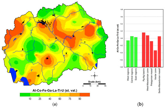 Spatial distribution of the factor scores of Factor 1 (Al, Co, Fe, Ga, La, Ti, and U) on the country level (a) and by regions and geological formations (b).