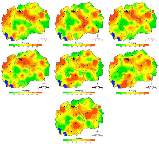Spatial distribution of the content of the elements from factor 1 (Al, Co, Fe, Ga, La, Ti, and U).