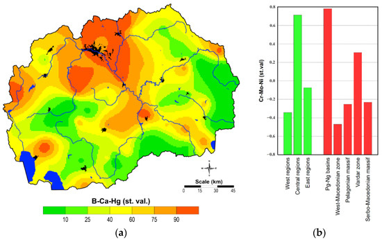 Spatial distribution of the factor scores of Factor 2 (B, Ca, and Hg) on the country level (a) and by regions and geological formations (b).