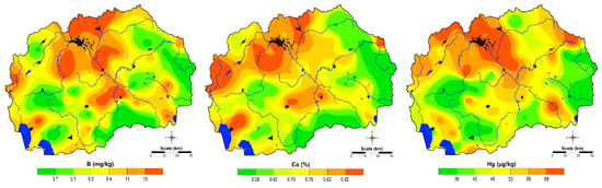 Spatial distribution of the content of the elements from factor 2 (B, Ca, and Hg).