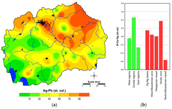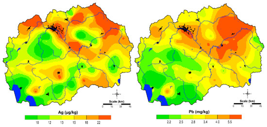The geochemical association of the elements Ag and Pb (Factor 3) is an anthropogenic factor and is related to the industrial activity in the country (Figure 9) with the highest levels in the samples from the central and northeastern part of the country (the vicinity of Skopje, Veles, Tetovo, Probištip, Makedonska Kamenica, and Kriva Palanka). More precisely, in the eastern region, the highest Ag and Pb levels were found in the Serbo-Macedonian Massif (19 µg/kg and 4.4 mg/kg) and in the Paleogene and Neogene basins (17 µg/kg and 4.2 mg/kg, respectively).