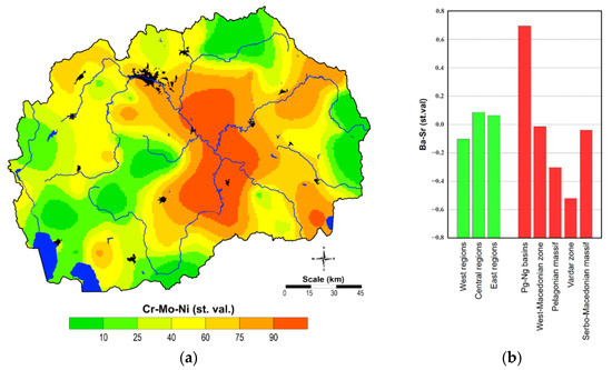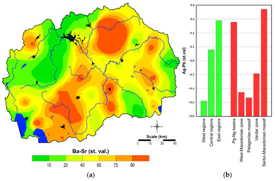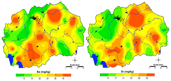 The geochemical associations of the elements Ba and Sr (Factor 4) are shown in Figure 11 and Figure 12. These elements are naturally distributed, which is not related to anthropogenic activities. Figure 11 shows that these elements are most abundant in the central region, shifting to the southern part of the country and to the eastern region and Povardarie, which is dominated by volcanic rocks [53]. The highest contents of these elements were found in the Paleogene and Neogene basins, followed by the Western Macedonian Zone and the Serbo-Macedonian Massif. The highest contents of Ba and Sr in the Ng-Pg basins were 36 mg/kg and 34 mg/kg, respectively.