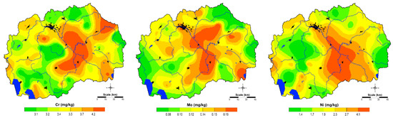 The association of the elements Cr, Mo, and Ni (factor 5) is a geogenic and anthropogenic association. High contents of these elements (Table 1 and Figure 13 and Figure 14) are found in the central region of the country, in the Paleogene and Neogene basins such as the Vardar zone, which are of geogenic origin and are due to pollution from the ferronickel smelter “FENI” in the region of Kavadarci, which processes ores enriched with these elements. The highest contents of Cr and Ni in the central region were 3.6 mg/kg and 3.2 mg/kg, and in the Paleogene and Neogene basins, the content of Cr was 3.8 mg/kg and of Ni 3.2 mg/kg. The Mo content in the central region and in the Paleogene and Neogene basins was 0.17 mg/kg.