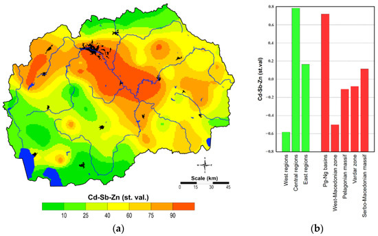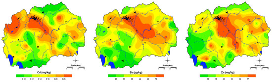 The spatial distribution of this compound of Cd, Sb, and Zn is shown in Figure 15 and Figure 16. The highest values for these elements were found in the central and eastern regions of the country and in the Paleogene and Neogene basins of the Serbo-Macedonian Massif. The highest values for Cd and Zn in the central region were 0.21 mg/kg and 25 mg/kg, respectively, and for Sb the highest value of 71 µg/kg was found in the Paleogene and Neogene basins. In the Skopje region, the highest values for these elements were found in the collected moss samples, which can be attributed to the urban and industrial activities. In the Veles region, the source of dust with these elements is the slag dump of the former Pb-Zn smelter [50]. High values of these elements were also found in the eastern parts of the country (Figure 15), especially in the vicinity of mines with flotation plants (Zletovo, Sasa, and Toranica). The weathering processes of the rock on site increase the content of these elements in the air and soil. The dispersion of corpuscular dust from the flotation waste and soil contributes to the detection of high levels of these elements in moss samples collected from these regions [34]. In addition, high levels of Zn were detected in moss samples collected in the Kavadarci town area, which can be attributed to air pollution from the ferronickel smelter.