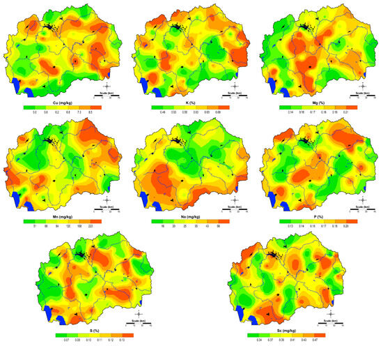 Due to the lack of correlation with other elements, eight elements were not included in a factor association (Cu, K, Mg, Mn, Na, P, S, and Sc). The distribution maps for the content of these elements are shown in Figure 17.