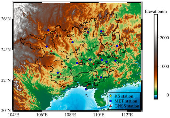 Distribution of GNSS stations, meteorological stations, and radiosonde stations in the Guangxi region of China.