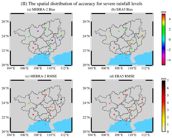Figure 2(I) demonstrates that, under heavy rainfall conditions, MERRA-2 PWV showed a bias range of −2.20 mm to 1.90 mm. MERRA-2 PWV exhibited negative biases in the southern part of Guangxi (except the Beihai station) and the northern part of Guangxi (except the Guilin station and the Rongshui station), thus indicating that the MERRA-2 PWV values were lower than the GNSS PWV values. The bias values were generally small, with a range of 0 mm to 2 mm. The Baise station in the southwestern part of Guangxi showed the smallest bias with only 0.03 mm. ERA5 PWV showed a bias range of 0.11 mm to 4.10 mm. It exhibited positive biases throughout the entire Guangxi region with significant variations between different stations. The southern part of Guangxi showed smaller overall biases, and Hechi Station in the northwest direction exhibited the smallest bias with only 0.11 mm. In terms of RMSE, MERRA-2 PWV showed a range of 2.66 mm to 4.79 mm. The RMSE values were smaller in the northwest and southeast parts of Guangxi. ERA5 PWV exhibited a range of 2.54 mm to 4.90 mm. Not much difference existed among most of the stations except for the Hezhou station in the northeast direction, which showed an RMSE close to 5 mm. However, the values in general were smaller than those of MERRA-2 PWV, and both datasets showed smaller RMSE values at the Tian’e, Wuzhou, and Hechi stations. Overall, the accuracy is quite stable over the whole Guangxi region for both datasets. However, based on the range of RMSE, individual station comparisons, and average RMSE, ERA5 exhibited slightly higher accuracy than MERRA-2.