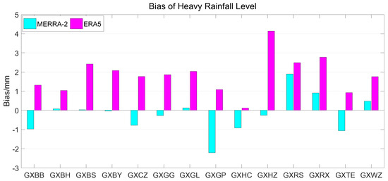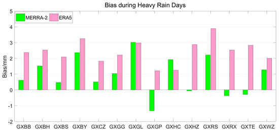 Biases between GNSS PWV and MERRA-2/ERA5 PWV at different stations for the heavy rainfall level.