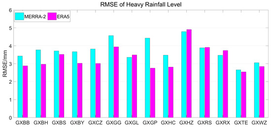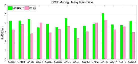 RMSEs between GNSS PWV and MERRA-2/ERA5 PWV at different stations for the heavy rainfall level.