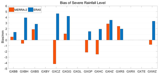 Figure 3 and Figure 4 provide an intuitive comparison of the applicability of different water vapor products under heavy rainfall conditions. In terms of bias, the range of variation for MERRA-2 PWV was significantly smaller than that of ERA5 PWV. MERRA-2 exhibited smaller biases than ERA5 at the Bobai, Beihai, Baise, Binyang, Chongzuo, Guigang, Guilin, Hezhou, Rongshui, Rongxian, and Wuzhou stations, with values ranging from 0 mm to 1 mm. Regarding RMSE, both reanalysis datasets showed relatively large values at around 3 mm. However, at most stations, the RMSE of MERRA-2 PWV was higher than that of ERA5 PWV except for the Guilin, Hezhou, and Rongxian stations, where MERRA-2 PWV had slightly lower RMSE than ERA5 PWV. The subsequent analysis will further examine whether the accuracy under severe rainfall conditions aligned with the performance under heavy rainfall conditions.