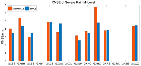 RMSEs between GNSS PWV and MERRA-2/ERA5 PWV at different stations for the severe rainfall level.