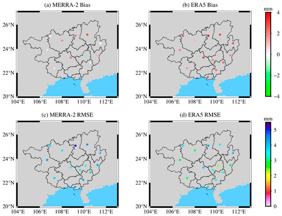 According to Figure 7, in terms of bias, MERRA-2 PWV exhibited smaller deviations in the western and southern parts of Guangxi with values fluctuating within the range of 0 mm to 1 mm. For example, the Bobai station had a bias of 0.61 mm. ERA5 PWV generally showed larger biases compared with MERRA-2 with values ranging from 1 mm to 4 mm. The deviations were smaller in the western and southeastern regions of Guangxi, such as the Chongzuo station with a bias of 1.82 mm. In terms of RMSE, MERRA-2 PWV exhibited lower values in the central region of Guangxi. The station with the best accuracy was the Guiping station in the central region, which had an RMSE value of 3.47 mm. The Guilin station in the northern part and the Rongshui station had RMSE values of 4.54 mm and 5.09 mm, respectively, thus indicating the poorest accuracy. Meanwhile, ERA5 PWV demonstrated higher accuracy in the western and central regions of Guangxi. For example, the Guiping station in the central region had the highest accuracy with an RMSE value of 2.33 mm, while the Baise and Chongzuo stations in the western region had RMSE values of 2.84 mm and 2.95 mm, respectively, thus indicating relatively high accuracy.